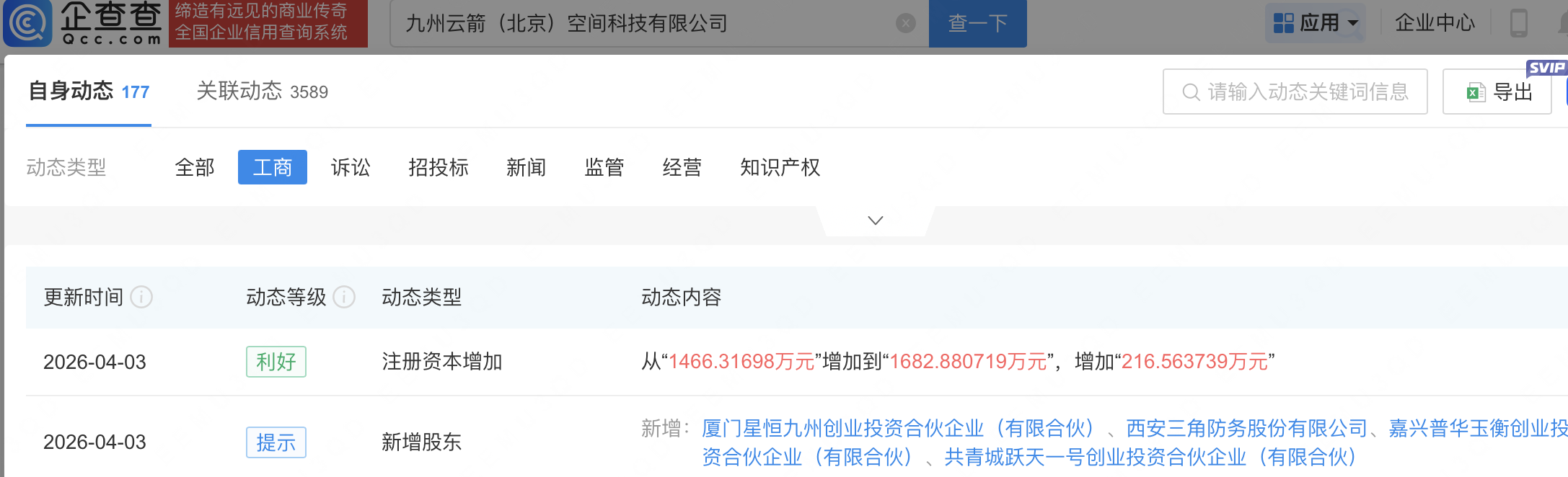 近日,九州云箭(北京)空间科技有限公司发生工商变更,新增三角防务(300775)等为股东,同时注册资本增至1682.88万元。企查查信息显示,该公司成立于2017年,经营范围包含:新材料技术推广服务;工程和技术研究和试验发展;火箭发动机研发与制造等。据其官网,该公司集液体火箭发动机设计研发、装配测试、配套飞行全流程服务为一体。
