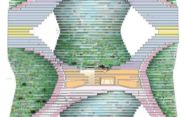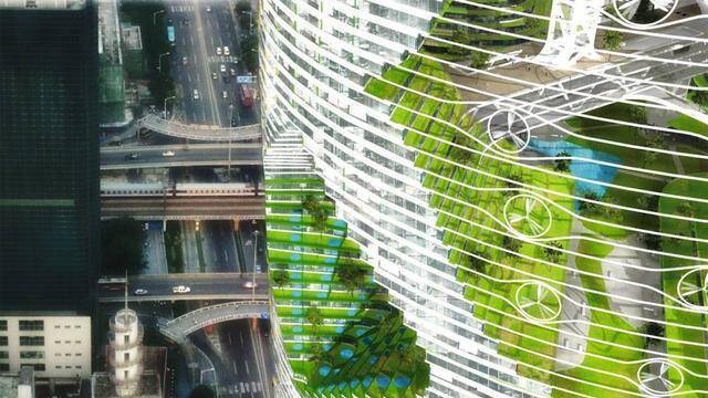 为此,建筑师不再死磕垂直电梯井,而是把地基摊开,像在山坡上造房子那样,把住宅、写字楼、商场、公园一层层“种”进这个庞然大物里。