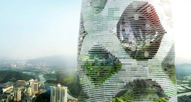 为契合中国风水里的“山水”概念,这栋楼的外形被设计成了连绵起伏的山峦。外墙上全是错落有致的绿色大露台,看着就像是一座悬在半空的“垂直森林”。
